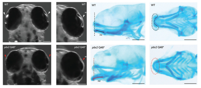 图2. 斑马鱼pitx2 Q48*纯合子突变体F1表型(红色箭头指示眼部前房发育不足,虚线显示颅骨畸形)
